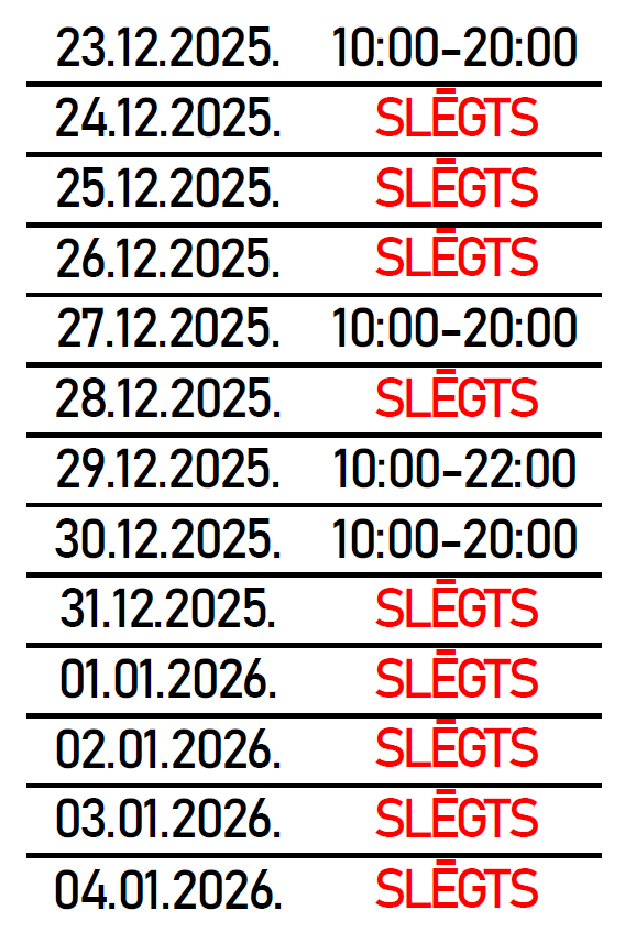 Baseina apmeklējums ar iepriekšēju pierakstu pa tālruni 20260526.Darba laiks svētku laikā no 23.12.2025 līdz 04.01.2026![]() Aktuālā informācija par 2025./2026. sezonu!Baseins atsāk darbu no 01.09.2025., baseina apmeklējums ar pierakstu pa tālruni 20260526.